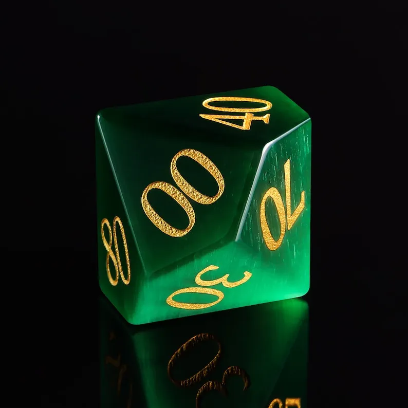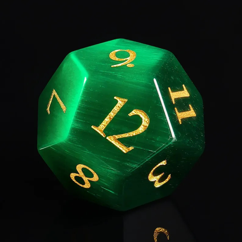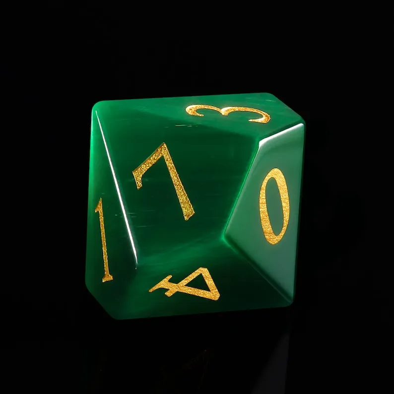 Green cat’s eye DND dice set with shifting glow, polished finish, clear numbers, balanced rolls.